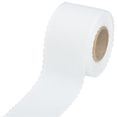 Aida-Stickband, mit gewelltem Rand, zum individuellen Besticken, Dekorieren und Basteln geeignet. Stofffarbe: weiss, Breite: 5 cm, Stickbreite: 4,3 cm, 5 m pro Rolle. Material: 100 % Baumwolle (ca. 6 Stiche/cm).