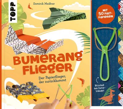 "Bumerang-Papierflieger mit Schleuder". Speziell entwickelt mit Bumerang-Effekt - die Flieger kommen alle zurück! In diesem Bastel-Set erhalten Sie eine Schleuder und 50 bunte Faltblätter – so können Sie sofort loslegen. Inhalt: Anleitungsheft für 9 verschiedene Bumerang-Flieger, die in einem Kreis zurückfliegen, 50 beidseitig bedruckte Faltblätter (19 x 24,5 cm), Schleuder. Für Kinder ab 7 Jahren.
