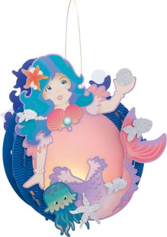 Bastel-Set Laterne "Meerjungfrau", Inhalt: 1 Drahtbügel, 1 Laternen-Rohling, 2 vorgestanzte Motivbogen, 2 Blatt Transparentpapier, 1 Blatt Glitterkarton, 1 Kerzentülle, 1 Laternenstab aus Holz, 100 3D-Klebepads und eine Anleitung. Fertige Grösse: 25 x 28 cm.