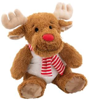 Bastelpackung "Rentier Robby"– nur noch zum Ausstopfen, mit gestreiftem Schal, Grösse: 26 cm. Komplett genähtes und vormontiertes Kuscheltier aus hochwertigem und sehr weichem Plüsch. Material: 100 % Polyester. Sie benötigen noch ca. 100 g Füllwatte.