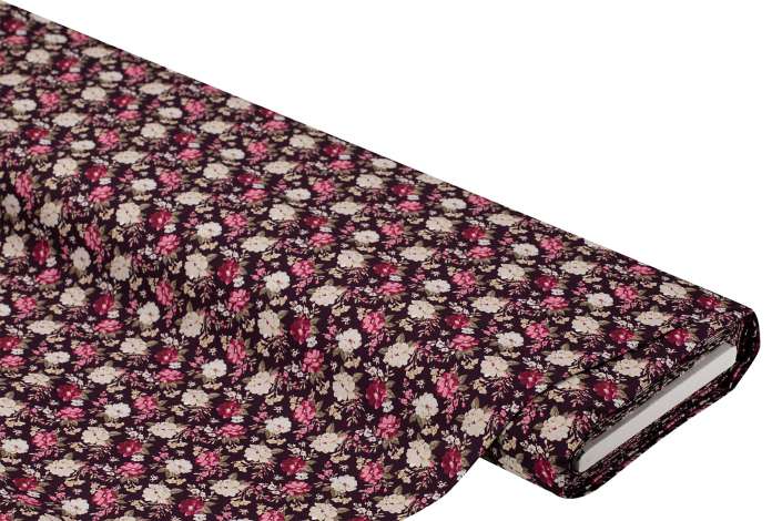 Baumwoll-Trachtenstoff "Blumen", Farbe: aubergine-color, digital bedruckt, Motivgrösse grosse Blume in Beere: 2 cm Ø, Breite: 145 cm, Gewicht: ca. 155 g/m². Material: 100 % Baumwolle.