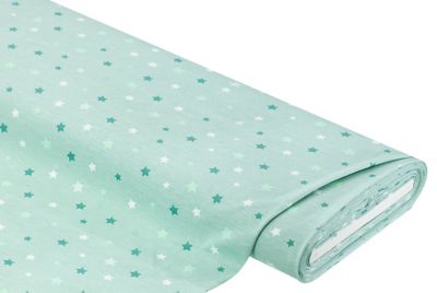 Baumwolljersey "Sterne", Farbe: aqua-color, leicht bi-elastisch, Motivgrösse Sterne: ca. 1–1,5 cm, Breite: 160 cm, Gewicht: ca. 160 g/m². Einlaufwert: 3–5 % in Länge und Breite. Material: 100 % Baumwolle.