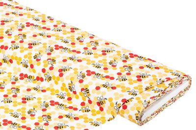 Exklusiv von buttinette: Baumwollstoff "Bienen & Waben", Farbe: gelb/rot, aus der Quiltserie "Mona", aus besonders feiner, weicher und hochveredelter Baumwolle (Renforcé), Motivgrösse Biene: 2,5 cm, Waben: 1 cm, Breite: 150 cm, Gewicht: ca. 130 g/m². Material: 100 % Baumwolle.