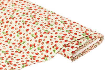 Exklusiv von buttinette: Baumwollstoff "Erdbeeren & Karo", Farbe: weiss-color, aus der Quiltserie "Mona", aus besonders feiner, weicher und hochveredelter Baumwolle (Renforcé), Motivgrösse Erdbeerrispe: 3 x 3,3 cm, Breite: 150 cm, Gewicht: ca. 130 g/m². Material: 100 % Baumwolle.