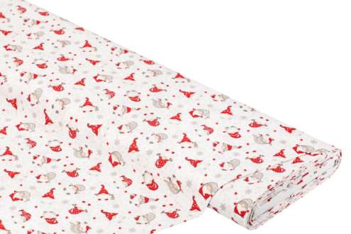 Exklusiv von buttinette: Baumwollstoff "Kleine Wichtel", Farbe: weiss/rot, aus der Quiltserie "Mona", aus besonders feiner, weicher und hochveredelter Baumwolle (Renforcé), Motivgrösse Wichtel mit roter Mütze: 2,5 x 3,5 cm, Breite: 150 cm, Gewicht: ca. 130 g/m². Material: 100 % Baumwolle.