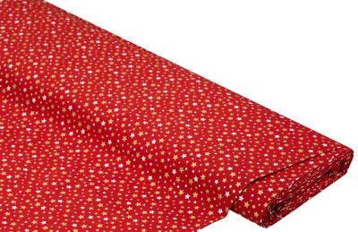 Exklusiv von buttinette: Baumwollstoff "Sterne", Farbe: rot/gold, mit goldenem Glitzerdruck, aus der Quiltserie "Mona", aus besonders feiner, weicher und hochveredelter Baumwolle (Renforcé), Motivgrösse: 5–10 mm. Breite: 150 cm, Gewicht: ca. 130 g/m². Material: 100 % Baumwolle.