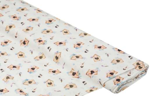 Baumwollstoff "Vogel & Häuschen", Farbe: offwhite/blau, Motivgrösse Vogel: 2,5 x 2 cm, Breite: 150 cm, Gewicht: ca. 110 g/m². Material: 100 % Baumwolle.