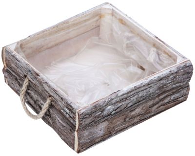 Borkengefäss, eckig, innen mit Folie und mit Henkel aus Jutekordel, Farbe: white-wash, Grösse: 25 x 25 x 9 cm.