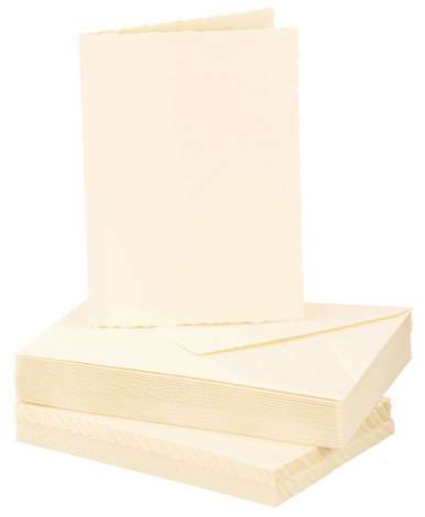 Büttenrandkarten mit Briefhüllen, Farbe: creme, Kartengrösse: 105 x 148 mm (DIN A6), Gewicht: 240 g/m², Briefhüllengrösse: 114 x 162 mm (DIN C6), Gewicht: 120 g/m², Inhalt: 25 Karten und 25 Briefhüllen.