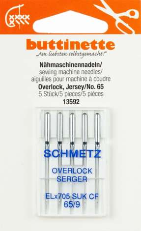 buttinette Overlock-Nähmaschinennadeln "Jersey" mit Kugelspitze, für Cover- und Overlockmaschinen System ELX 705, in Flachkolben-Ausführung, Stärke: 65, Inhalt: 5 Stück. Material: Stahl.