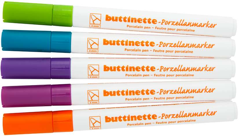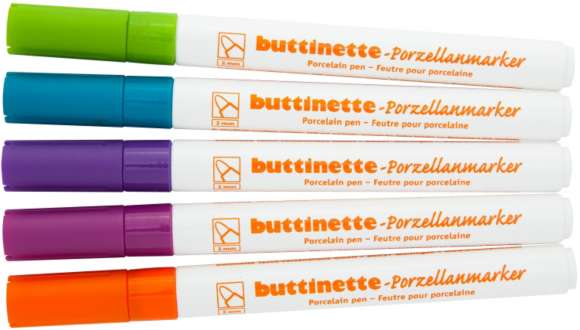 buttinette Porzellanmarker "Trend", Strichstärke: 2 mm, Inhalt: 5 Stifte in den Farben Türkis, Violett, Pink, Hellgrün und Orange. Nachdem die Farben getrocknet sind, können diese bei 160° C im Backofen für 30 min. eingebrannt werden. Nach dem Einbrennen ist die Bemalung bis 50° C spülmaschinenfest.