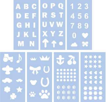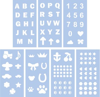 buttinette Schablonen "Motive" aus Kunststoff, Farbe: transparent, Masse je Schablone: 10 x 20 cm, Motivgrösse 0,9–4,4 cm, Höhe der Buchstaben und Zahlen 2,2 cm, Inhalt: 7 Stück.