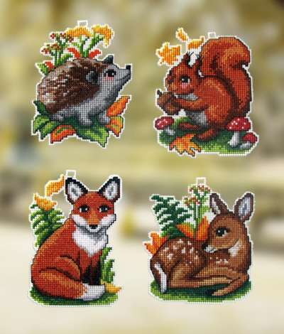 buttinette Stramin-Aufhänger "Waldtiere", im 4er-Set. Die Motive werden in Kreuzstich auf Plastik-Stramin gestickt (ca. 5,4 Stiche/cm). Komplettpackung: Anleitung, Zählvorlage, Garn, Sticknadel. Grösse: Fuchs 8,5 x 12,5 cm, Igel, 9 x 11 cm, Rehkitz 10 x 10,5 cm, Eichhörnchen 8,5 x 11,5 cm. Material: Plastik-Stramin, Garn 100 % Baumwolle.
