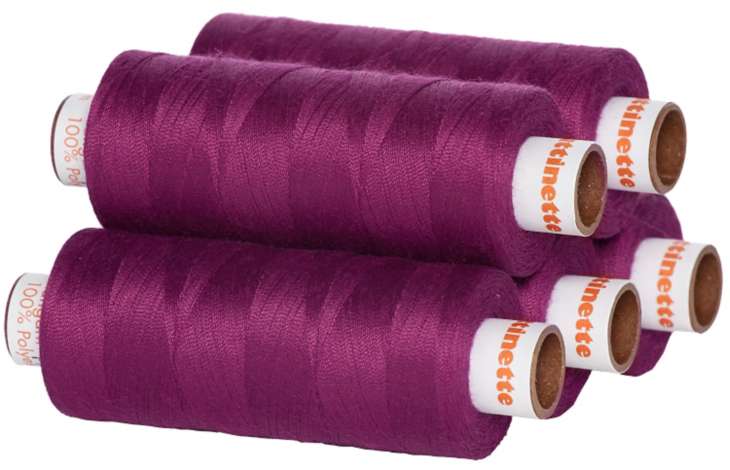 buttinette Universal-Nähgarn, Farbe: beere, Fadenstärke: 100, Nadelstärke: 60 - 100, Inhalt: 5 Spulen, 500 m pro Spule. Material: 100 % Polyester.