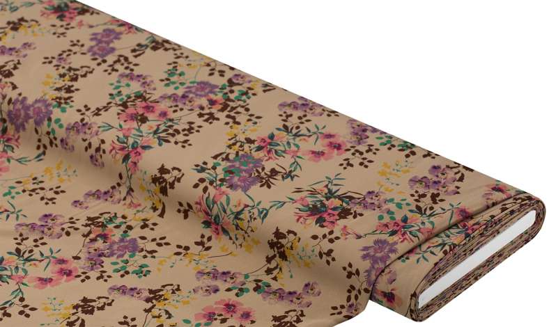 Ob Kleider, Blusen, Tuniken oder Röcke – aus diesem Crêpe zaubern Sie geschmackvolle Mode, die jahrelang Freude macht. Das Design mit rosa und lila Blumen vor hellbraunem Fond lässt sich vielseitig kombinieren. Der Crêpe ist bügelfrei und somit auch ideal für den Reisekoffer. So avancieren Ihre neuen Unikate ganz schnell zu Lieblingsstücken! Übrigens: Die leicht körnige Struktur des Crêpe verhindert ein Verrutschen des Stoffes und erleichtert so das Nähen. Jetzt bestellen und auf Ihre Projekte freuen!