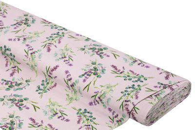 Dekostoff "Lavendel & Eukalyptus" aus der Serie Lorena, Farbe: lila-color, Motivgrösse kleiner Lavendelstrauss: 12 x 7 cm, Breite: 140 cm, Gewicht: ca. 170 g/m². Material: 70 % Baumwolle, 30 % Polyester.