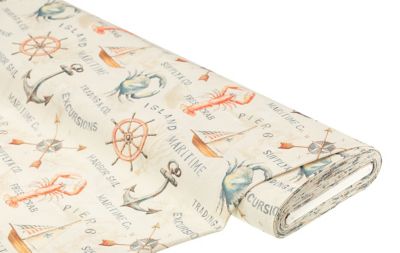 Dekostoff "Meerestiere" aus der Serie Lorena, Farbe: beigegrau-color, Motivgrösse Krebs: 10 x 7 cm, Rapport: x cm, Breite: 140 cm, Gewicht: ca. 170 g/m². Material: 50 % Baumwolle, 50 % Polyester.