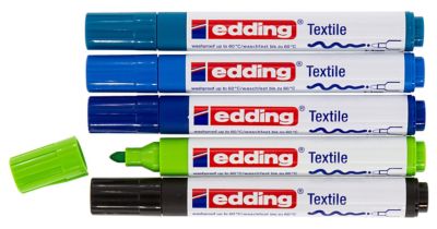 edding Textilmarker für helle Textilien, Inhalt: 5 Stifte in den Farben schwarz, marine, royal, hellblau, grün, Strichstärke: 2–3 mm, nach Bügelfixierung waschfest bis 60°C.
