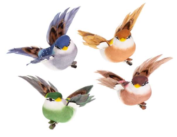 Federvögel mit Klammer, innen aus Styropor, Farbe: braun, blau, ocker, grün, Grösse: 8 x 10,5 cm, Inhalt: 4 Stück.