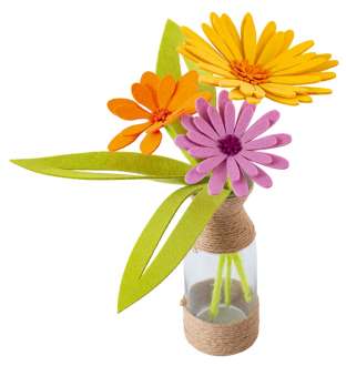 Bausatz "Blumenstrauss" aus Filz, zum Basteln von drei Blumen in den Grössen 27 x 12 cm und 35 x 17 cm und drei Blättern in der Grösse 25 x 6,5 cm, Farben: gelb, orange, flieder, grün, Inhalt: Filz-Stanzteile, Drahtstiele und eine Anleitung. Material: 100 % Polyester. Nur für Dekorationszwecke geeignet.