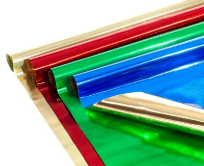 folia Alufolien, Farben Vorderseite: rot, grün, blau, gold, Rückseite: gold, Breite: 30 cm, Gewicht: 45 g/m², Inhalt: 4 Rollen à 50 cm = 2 Meter.