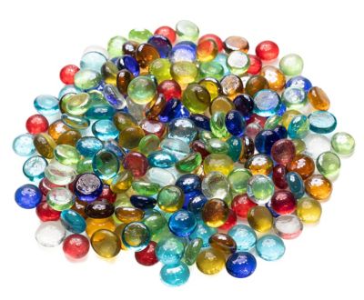 Glas-Nuggets-Mix, Grösse: 12–14 mm, Stärke: 6 mm, Rückseite flach. Inhalt: 500 g = ca. 160 Stück, Farbe je nach Anfall.