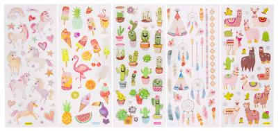 Glitzer-Sticker "Exotic", selbstklebend, Motive: Flamingo, Kaktus, Lama, Einhorn und Ethno, Bogengrösse: 10 x 23 cm, Motivgrösse: 1–5 cm, Inhalt: 5 Blatt mit verschiedenen Motiven.