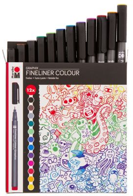 Marabu Graphix Fineliner "Doodle Supreme" in 12 verschiedenen Farben. Hochwertige, lichtbeständige, wasserbasierte und geruchsarme Pigmenttusche, blutet nicht aus. Fineliner in der Strichstärke 0,5 mm mit metallgefasster Kunststoffspitze, ideal für Illustrationen, Skizzen, Zeichnungen und vieles mehr.