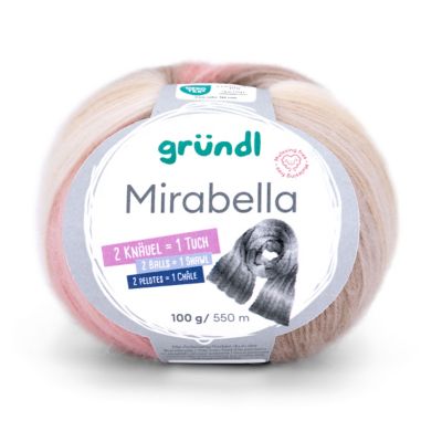 gründl Mirabella. Ein wunderschöner Name für eine wunderschöne Wolle! Lassen Sie sich von dem kuscheligen Wollmischgarn mit angerauter Oberfläche verwöhnen – beim Handarbeiten und beim Tragen! Dank der fülligen und leichten Struktur ist der Materialverbrauch gering; so lassen sich aus einem Knäuel ein kleines Tuch stricken, aus zwei Knäueln sogar ein grosses Tuch, dessen kostenlose Anleitung Sie in der Banderole finden. Aber auch für feine Strickpullover, luftige Cardigans und leichte Mützen ist das weiche, leichte, flauschige und hautsympathische Garn bestens geeignet. Haben Sie schon Ihre Lieblingsfarbe bei den tollen Farbverläufen entdeckt? Sie sind in sich harmonisch aufeinander abgestimmt und decken alle Facetten ab – von dezent bis fröhlich bunt!