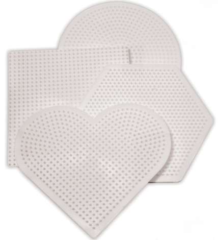 Hama Stiftplatten, Inhalt: 1x Kreis 15,5 cm Ø, 1x Herz 17,5 x 16 cm, 1x Viereck 14,5 x 14,5 cm und 1x Sechseck 14,5 x 16,5 cm, aus Kunststoff.