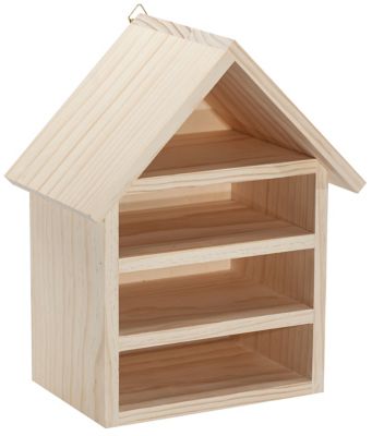 Haus "Insektenhotel" aus Holz, mit Aufhängung an der Rückseite und 4 Fächern zum Befüllen mit Naturmaterialien wie z.B. Zapfen, Ästen, Bambusröhrchen, uvm., Farbe: natur, Grösse: 23 x 16 x 30 cm.