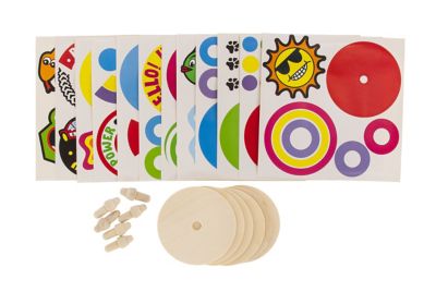 Holz-Kreisel-Bastelset zum Basteln von 6 Kreiseln. Inhalt: 12 Motiv-Stickerbogen, 6 Holz-Kreisel zum Zusammestecken und eine Anleitung.