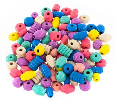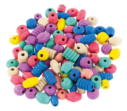 Holzperlen, in verschiedenen Formen und Farben, Farbe: pastell, Grösse: bis ca. 1,8 cm Ø, Inhalt: 500 g = ca. 700 Stück (je nach Anfall, Stückzahl variiert je nach Grösse der Perlen). Lochbohrung: ca. 0,5 cm.
