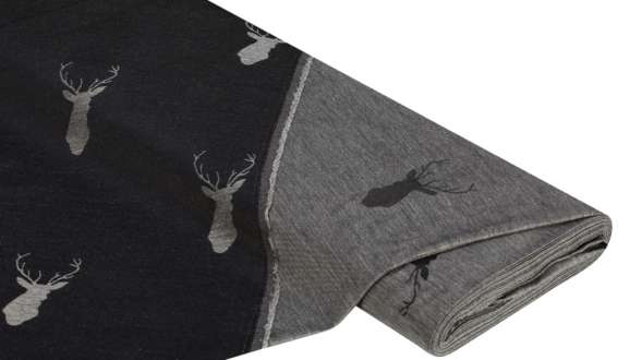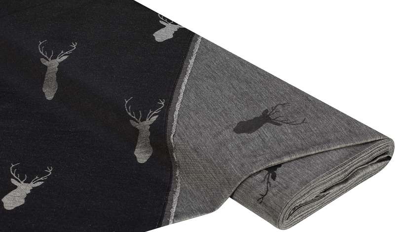 Jacquard "Hirsch", Farbe: grau/schwarz, Motivgrösse: 9,5 x 5,5 cm, Motiv quer zur Webkante verlaufend, Breite: 140 cm, Gewicht: ca. 170 g/m². Material: 72 % Polyester, 28 % Viskose.