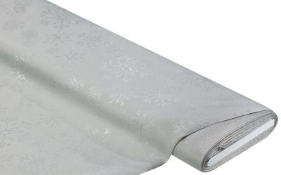 Winterlicher Jacquard "Schneekristalle" mit Glitzergarn, Farbe: hellgrau/silber, Motivgrösse: 3–10 cm Ø, Breite: 180 cm, Gewicht: ca. 115 g/m². Einlaufwert: ca. 1 % in Länge und Breite. Material: 70 % Polyester, 30 % Metallfaser.