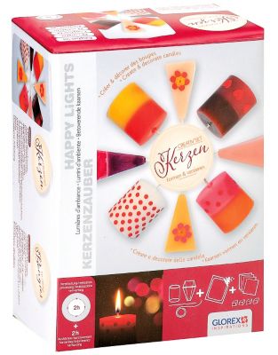 Kerzen-Creativ-Set, zum Formen und Verzieren von Kerzen, Inhalt: 1 Kerzengiessform Zylinder (8 cm hoch, 5,5 cm Ø), 1 Kerzengiessform Pyramide (4,5 x 4,5 x 8 cm), 300 g Kerzengiesswachs, 4 Farben zum Einfärben des Kerzengiesswachses (gelb, rot, blau, grün), 4 Verzierwachsplatten zum Dekorieren, thermobeständige Knetmasse, Holzstäbchen, Docht und eine Anleitung.