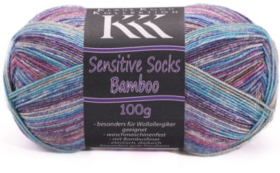 KKK Sensitive Socks Bamboo "Pastell". Das ideale Sockengarn für Woll-Allergiker! Wer auf Schurwolle empfindlich reagiert und trotzdem nicht auf den Komfort handgestrickter Socken verzichten möchte, ist mit diesem Garn bestens beraten. Der Anteil natürlicher Bambusfaser bewirkt ein angenehmes Fussklima, da das Material die Körperwärme bestens reguliert und ein hohes Mass an Feuchtigkeit aufnehmen kann, ohne sich feucht anzufühlen. Bambus schenkt im Sommer eine angenehme Kühle, ist aber gleichzeitig wärmend im Winter. Die strapazierfähige Mischung ist formstabil, waschmaschinenfest, temperaturausgleichend und natürlich filzfrei.