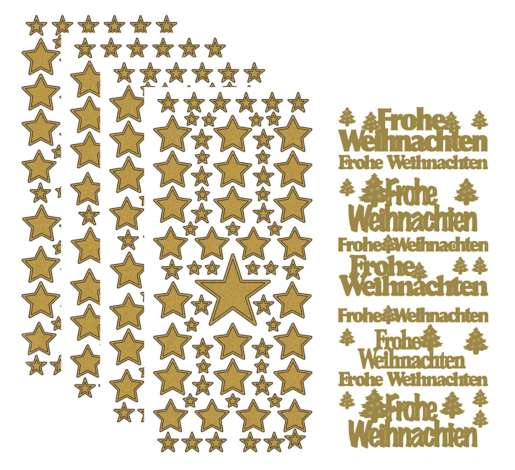 Klebesticker "Sterne & Weihnachten", einseitig klebend, Farbe: gold, Bogengrösse: 23 x 10 cm, Motivgrösse: 0,8–9 cm, Inhalt: 5 Bogen.