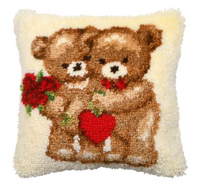 Knüpfkissen "2 Bärchen". Komplettpackung: Anleitung, Garn. Ohne Kissenrücken, Kissenfüllung, Knüpfhaken. Grösse: 40 x 40 cm. Material: Stoff handbemalter Stramin 52 % Baumwolle, 48 % Polyester (ca. 18 Stiche/10 cm), Garnschnittpackungen 100 % Polyacryl.