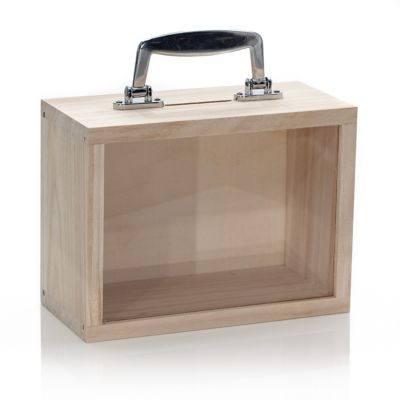 Koffer aus Holz, mit Kunststoffgriff, Acrylscheibe, herausnehmbarer Rückwand und Schlitz an der Oberseite, Farbe: natur, Grösse: 20 x 10 x 15 cm. Ohne Inhalt.