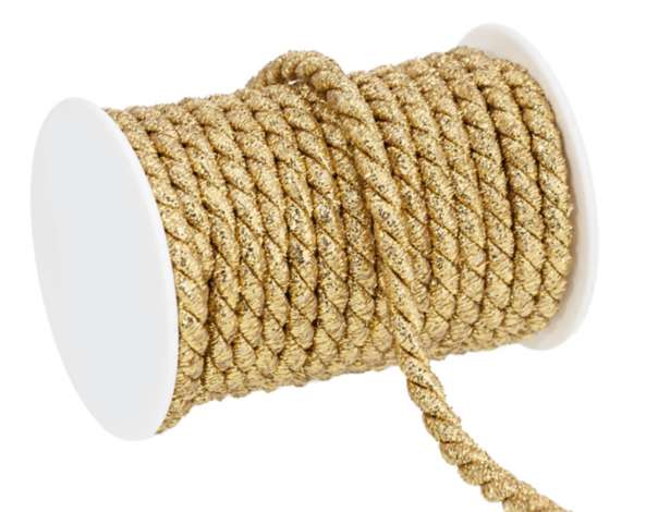 Kordel mit Glitter-Effekt, Farbe: gold, Stärke: 8 mm, 10 m pro Rolle. Material: 90 % Baumwolle, 10 % Polyester.