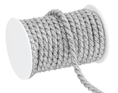 Kordel mit Glitter-Effekt, Farbe: silber, Stärke: 8 mm, 10 m pro Rolle. Material: 90 % Baumwolle, 10 % Polyester.