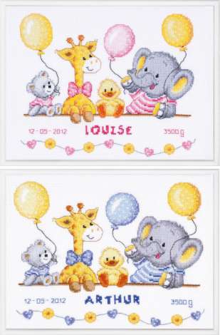 Kreuzstichbild "Baby Tiere". Komplettpackung mit Arbeitsanleitung, Zählvorlage, Alphabet, Zahlen, Garn und Sticknadel, ohne Rahmen, inkl. Garn in Blau und Rosa. Die Zählvorlage enthält alle Buchstaben des Alphabets und alle Zahlen, somit können Sie jeden Namen und jedes Datum beliebig einsticken. Stofffarbe: weiss, Grösse: 27 x 22 cm, Stickerei: 23 x 19 cm. Material: Aida-Stoff und Garn 100 % Baumwolle (ca. 5,4 Stiche/cm).