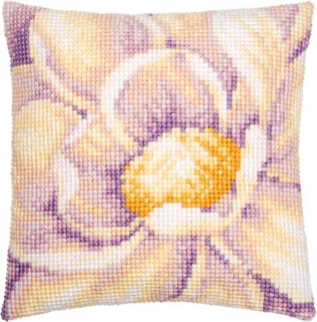 Kreuzstichkissen "Blütenkelch". Superleicht zu sticken, geeignet für Kinder ab 8 Jahren. Komplettpackung: Anleitung, Garn, Sticknadel. Ohne Kissenrücken und -füllung. Grösse: 40 x 40 cm. Material: Stoff handbemalter Stramin 100 % Baumwolle (ca. 18 Stiche/10 cm), Garn 100 % Polyacryl.