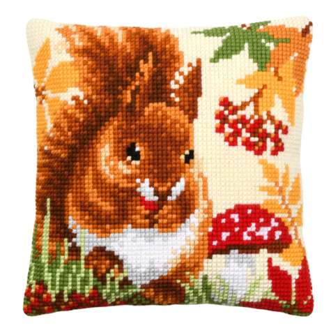 Kreuzstichkissen "Eichhörnchen Herbst". Superleicht zu sticken, geeignet für Kinder ab 8 Jahren. Komplettpackung: Anleitung, Garn, Sticknadel. Ohne Kissenrücken und -füllung. Grösse: 40 x 40 cm. Material: Stoff handbemalter Stramin 100 % Baumwolle (ca. 18 Stiche/10 cm), Garn 100 % Polyacryl.