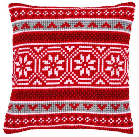Kreuzstichkissen "Norweger-Muster". Superleicht zu sticken, geeignet für Kinder ab 8 Jahren. Komplettpackung: Anleitung, Garn, Sticknadel. Ohne Kissenrücken und -füllung. Grösse: 40 x 40 cm. Material: Stoff handbemalter Stramin 100 % Baumwolle (ca. 18 Stiche/10 cm), Garn 100 % Polyacryl.