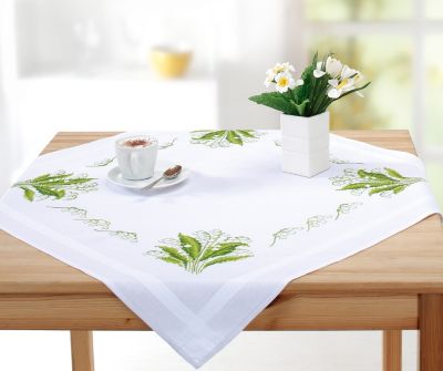Kreuzstichmitteldecke "Maiglöckchen" mit Webrand, randfertig gesäumt, vorgedrucktes Motiv, Komplettpackung mit Arbeitsanleitung, Garn und Sticknadel. Stofffarbe: weiss, Material: Stoff und Garn 100 % Baumwolle.