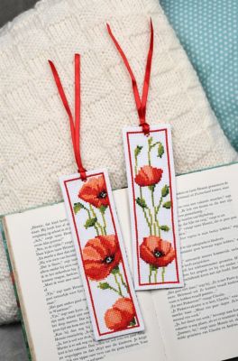 Lesezeichen "Mohnblüten", im 2er-Set, zum Besticken nach Zählvorlage in Kreuzstich (ca. 5,4 Stiche/cm). Komplettpackung: Anleitung, Zählvorlage, Garn, Sticknadel. Stofffarbe: weiss. Grösse: 6 x 20 cm. Material: Aida-Stoff und Garn 100 % Baumwolle.