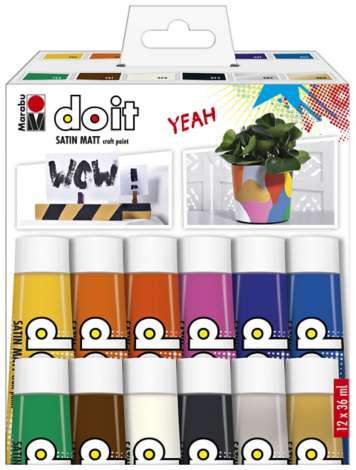 Marabu Do It Acrylfarben, auf Wasserbasis, wetterfest, vegan, geeignet auf vielen Untergründen wie Holz, Papier, Stein, Terrakotta, Styropor uvm. Farben: mandarine, orange, zinnoberrot, rosa, pflaume, mittelblau, minze, kakao, weiss, schwarz, silber und gold. Inhalt: 12x 36 ml.