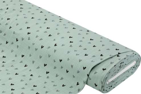 Musselin/Doppel-Gaze "Herzchen", Farbe: mint-color, Motivgrösse Herz: 1,5 cm Ø, Breite: 130 cm, Gewicht: ca. 120 g/m². Material: 100 % Baumwolle.